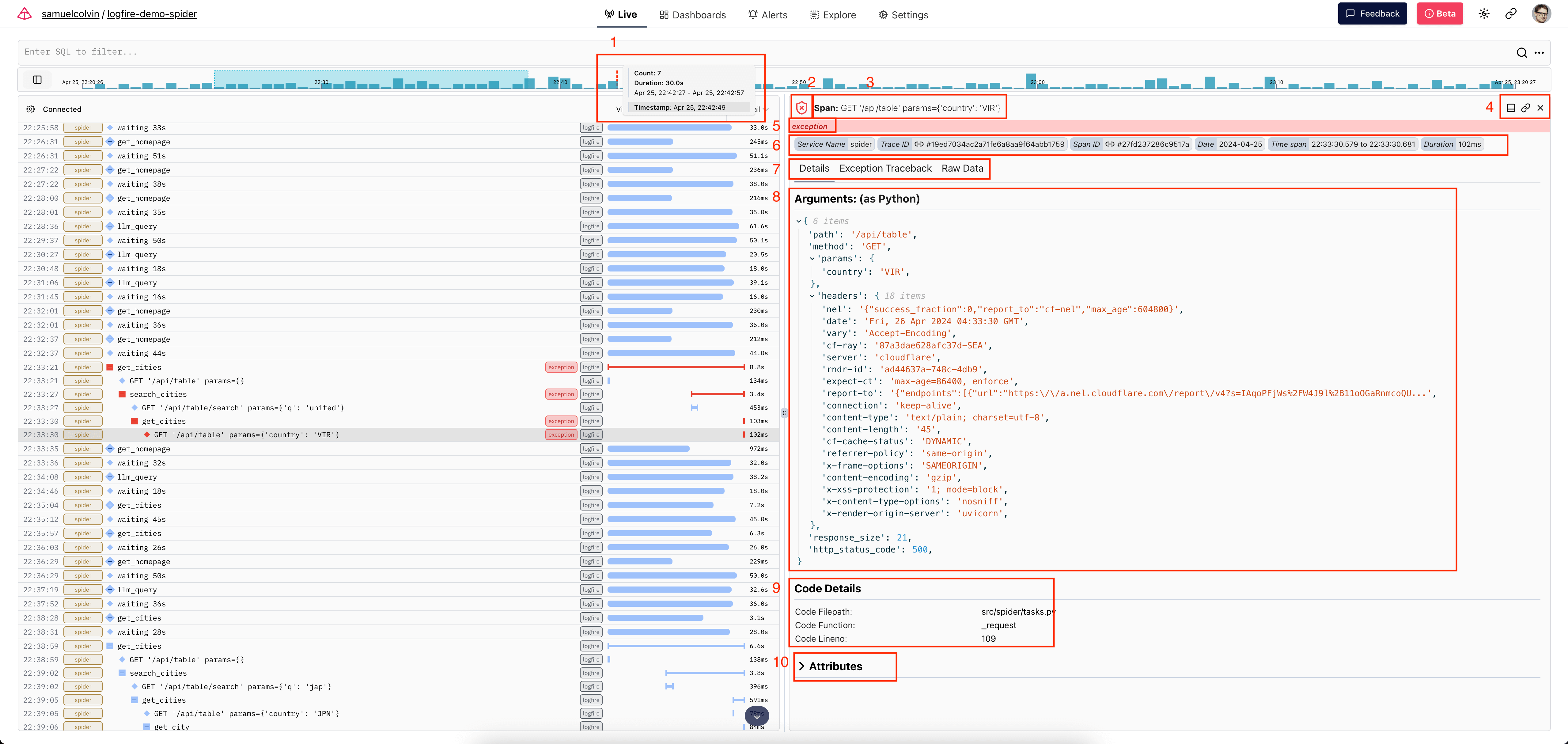 1. Organization and project labels: In this example, the organization is samuelcolvin, and the project is logfire-demo-spider. You can click the organization name to go to the organization overview page; the project name is a link to this page.